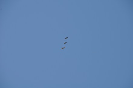 I took pictures of a third large flock and then three stragglers (teenagers, most likely, sleeping late) soaring fast. See the two pictures below.