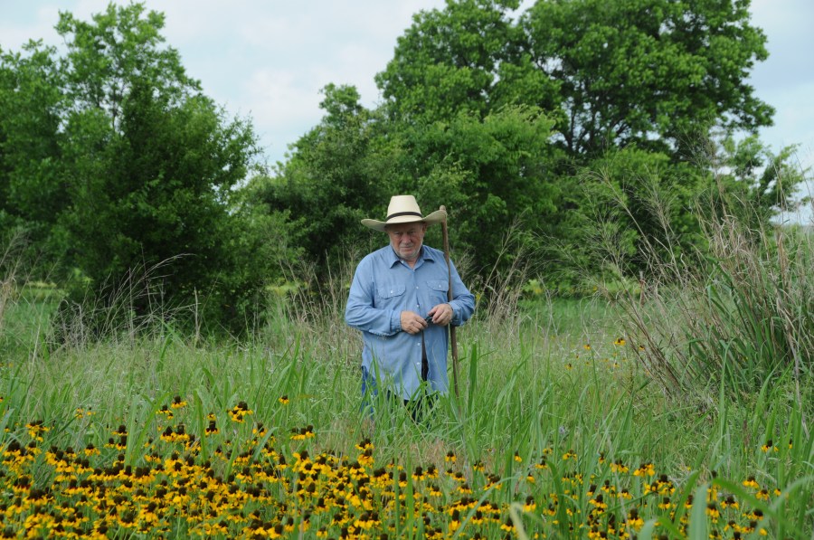 I am actually in a much, much better mood than what this photograph belies. It’s hot and I’ve been scooping out Bull Nettle. Please note the large sombrero. Notice the Big Bluestem grass to my left, a native grass of western North America.