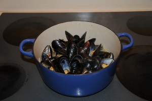 Here you can see the mussels, after being boiled in white wine and shallot broth, have opened up. We’ve all been trained in family etiquette, so the eating of mussels with small forks or other instruments is known well. Well, there’s another way to do it! Take the mussel out of one shell and use the empty shell to pick the mussels out of the others — a method showed us by a French waiter from Marseilles.