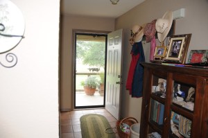 The hallway has a hat and coat rack on the right side of the photograph. I have counted as many as ten hats and caps on the rack, and during the winter, coats and rain gear hang appropriately for convenient use.