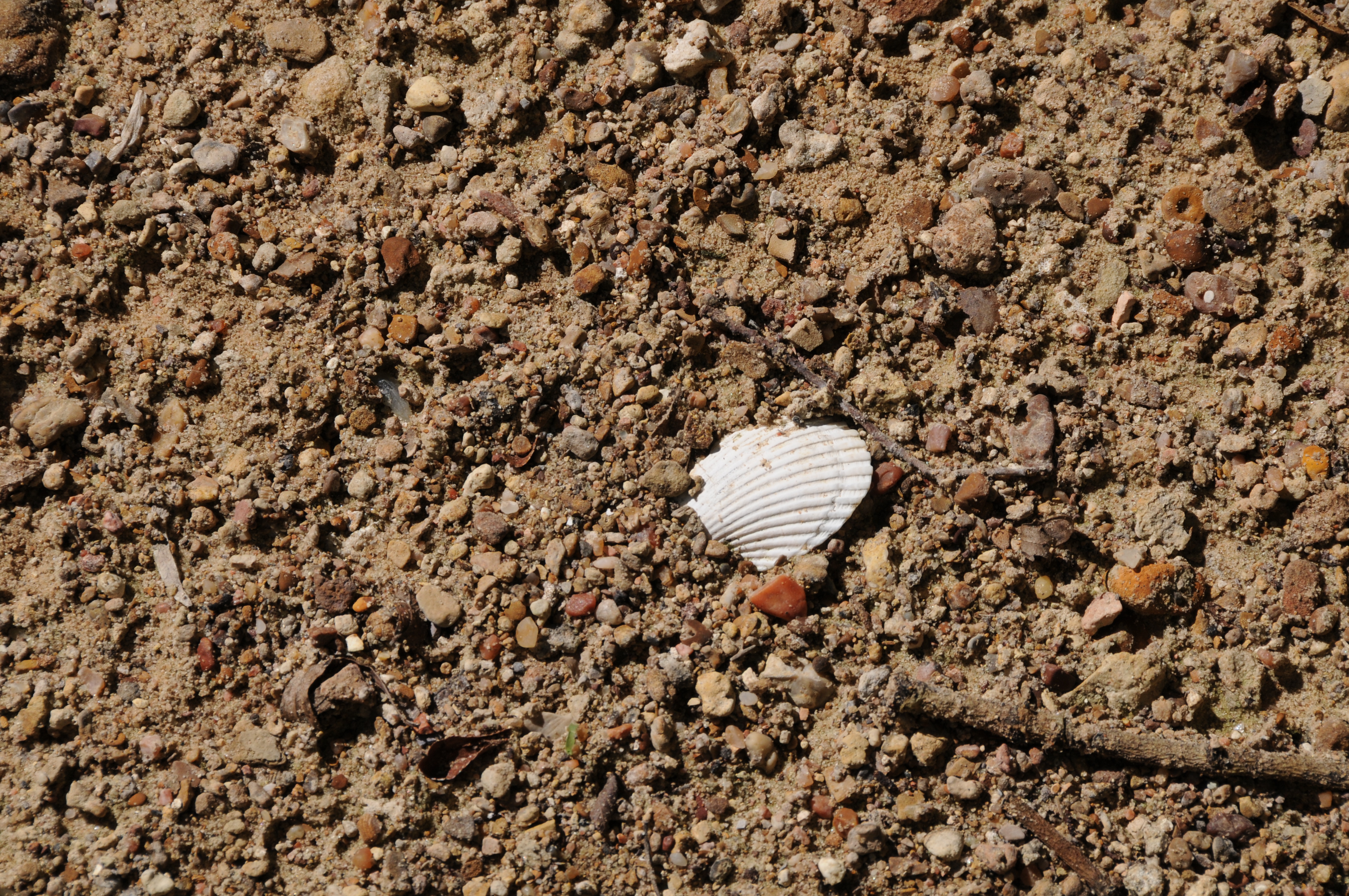 I had photographed a scallop shell and when I enlarge the photo back at the house I see many things I did not see when I took the shot.  Stones small and colorful.  A poprock.  Seed hulls.  Twig.  Bone.  Leaves.  The outline of the white shell reminds me of Neanderthal decorations I once saw in a textbook.  Earthly things held together in a creek bed matrix.  I notice that the white scallop shell has sand on it.  Should I have brushed it off to improve the photogenic quality of the shell?  I briefly think, yes, but then, no.  I take nature as I have discovered her — earthy, water-coursed, bursting with color and containing the past in bone and hull.  A receptacle.