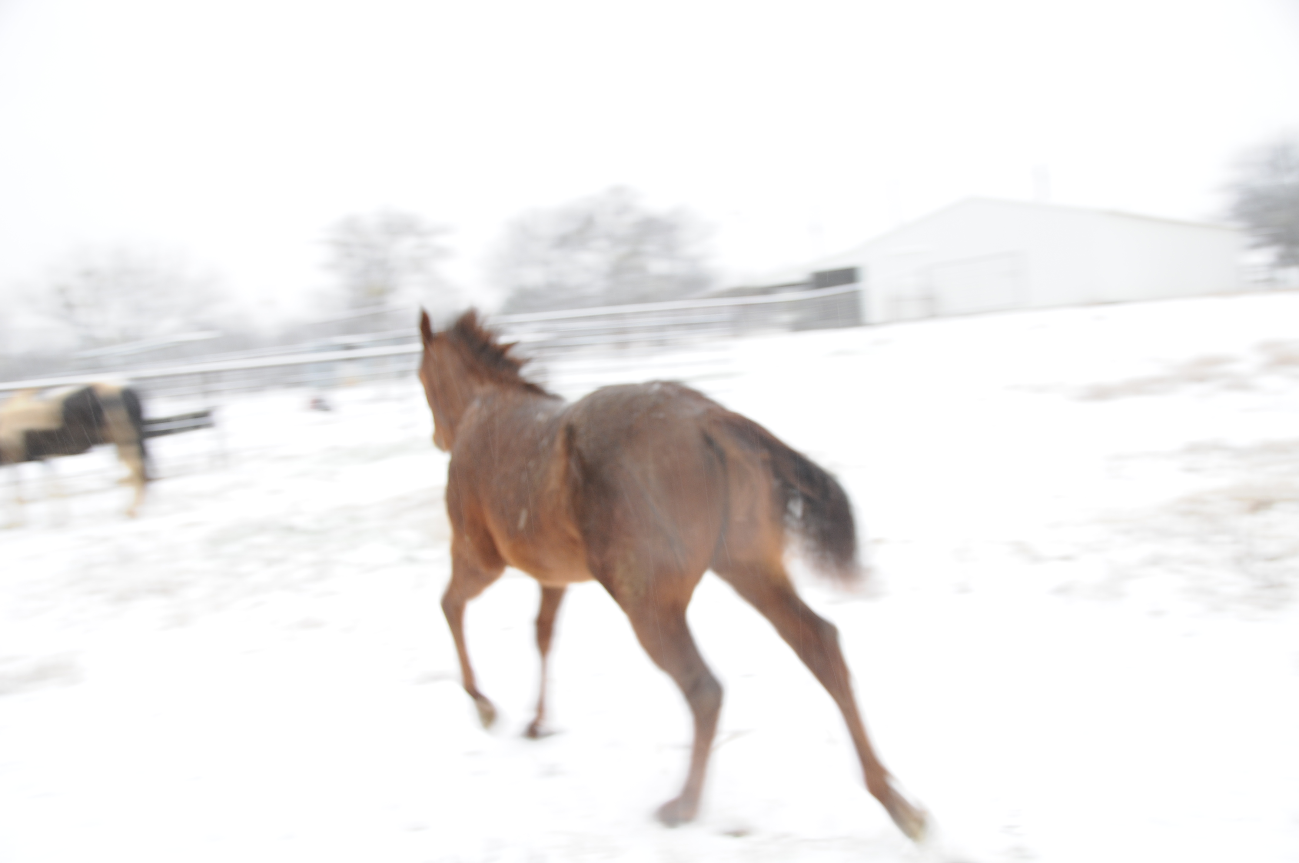 Shiney galloping to the corral during winter. No fear of the sun disappearing here.