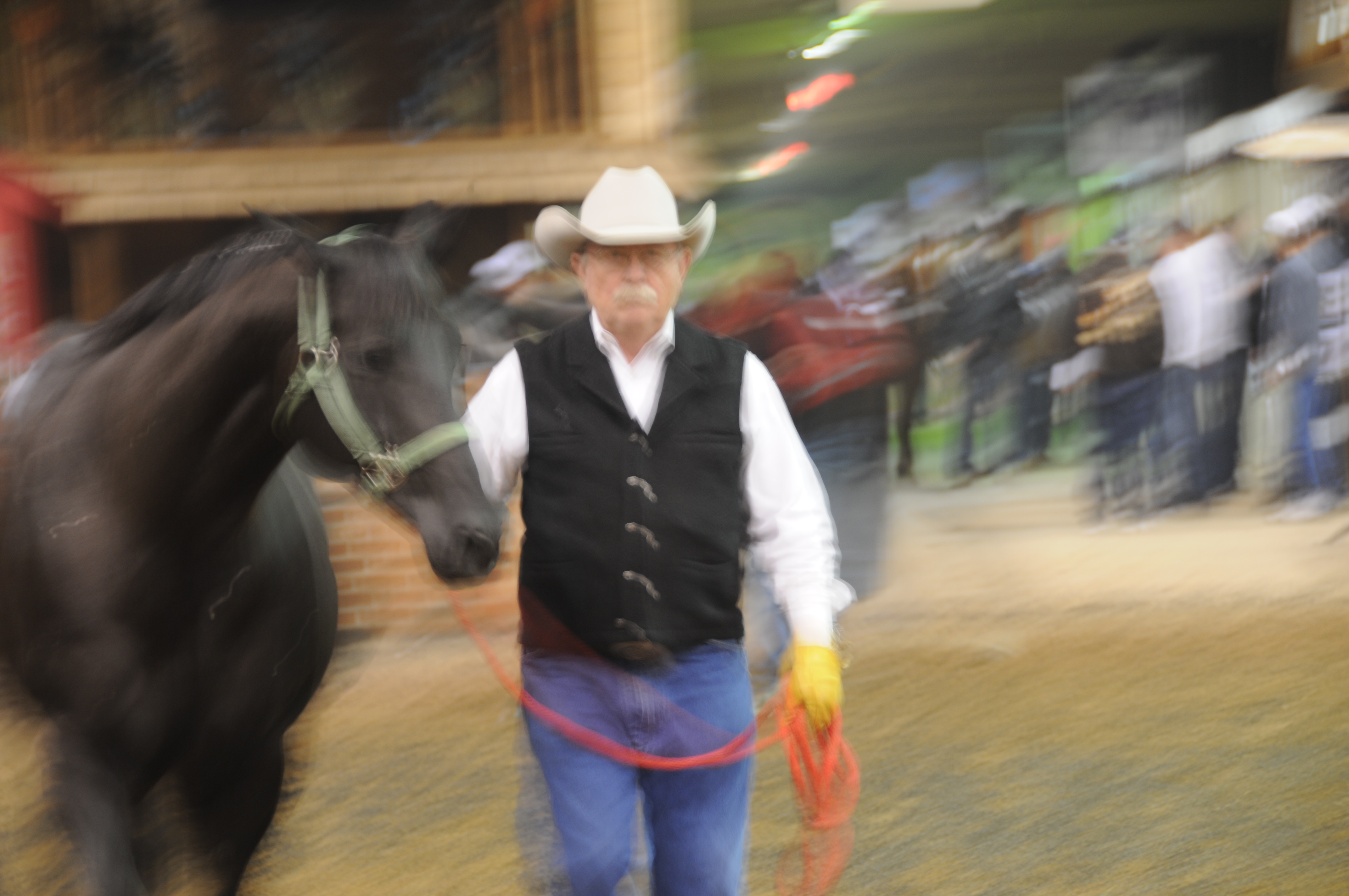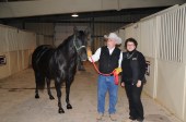 In the listing of horses to be sold at Heritage Place, our second and third horse, Sweet Hija and the unborn foal, came up for bid at 8:00 p.m. Friday night.  All day long I prepped Sweet Hija and her unborn foal for the big event, going into the make-up ring — a place where you walk your horse in an open area — and then up the walk to the auction arena where a professional handler takes control.  When the presentation began, I walked with Hija and she showed her King Ranch style:  energetic, fully alert, stepping high, ears forward.  Yet she stayed close by me as I walked her from her left side.  For five minutes she presented her Running W, the brand of King Ranch, to the crowd before I handed her off to the handler that took her into the the bidding arena.