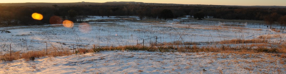 In the far background are the Twin Mountains of north Erath County, Texas, 1,400 feet. Ducks swim and feed upon and beneath the pond in the middle of the photograph even in this cold weather.  The gate opens into the arena pasture.  The small mound with cedar posts upon it, to the far, far left in the photograph (you may have to enlarge), is Lilly’s Mound, 1,065 feet.  The mound is small and does not stand out in the photograph — in fact, hardly noticeable — , but it is a meaningful part of this good earth to me and Brenda and Star.