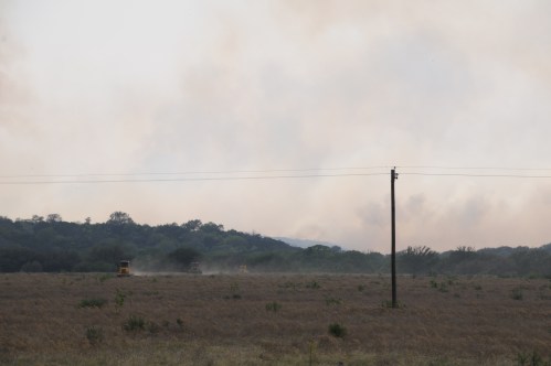 Bulldozers in field, cutting fire lanes along ranch pastures.