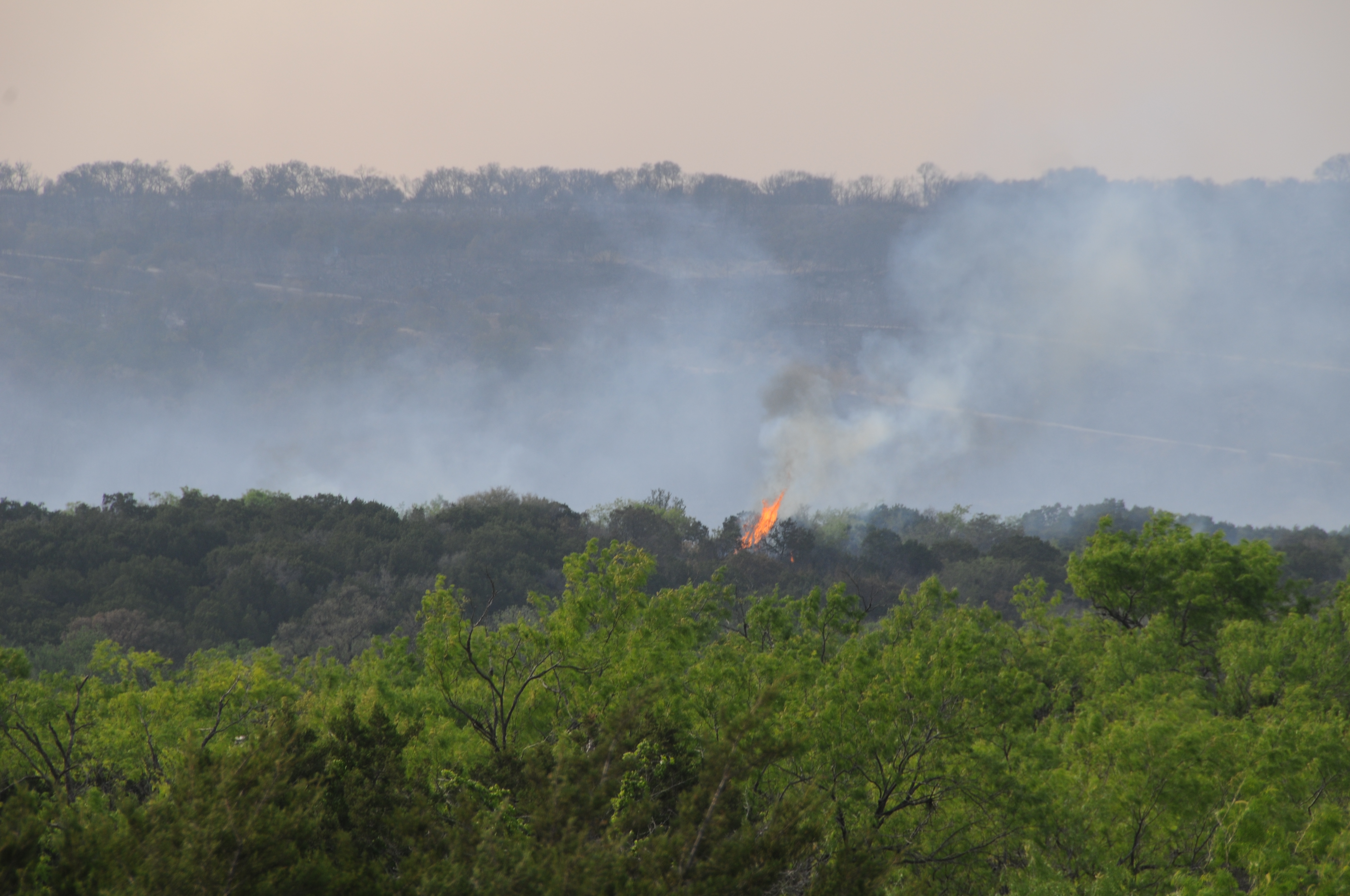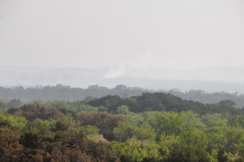 The winds are still high at 8:30 p.m., but are diminishing on our place in north Erath County, Texas (Flying Hat Ranch or FHR).  As you can see from the photos, we are fortunate that Spring has greened the pastures and trees about our porch and pastures.  North of us, only five miles or so, the country is not as green and in the Cross Timbers area north of Strawn, cedar trees and dry grass give fuel for fire.  I have neither heard nor read how these fires started, but arson is not suspected.  These events tumble out of random, discrete events, and we will probably never know how these fires began.