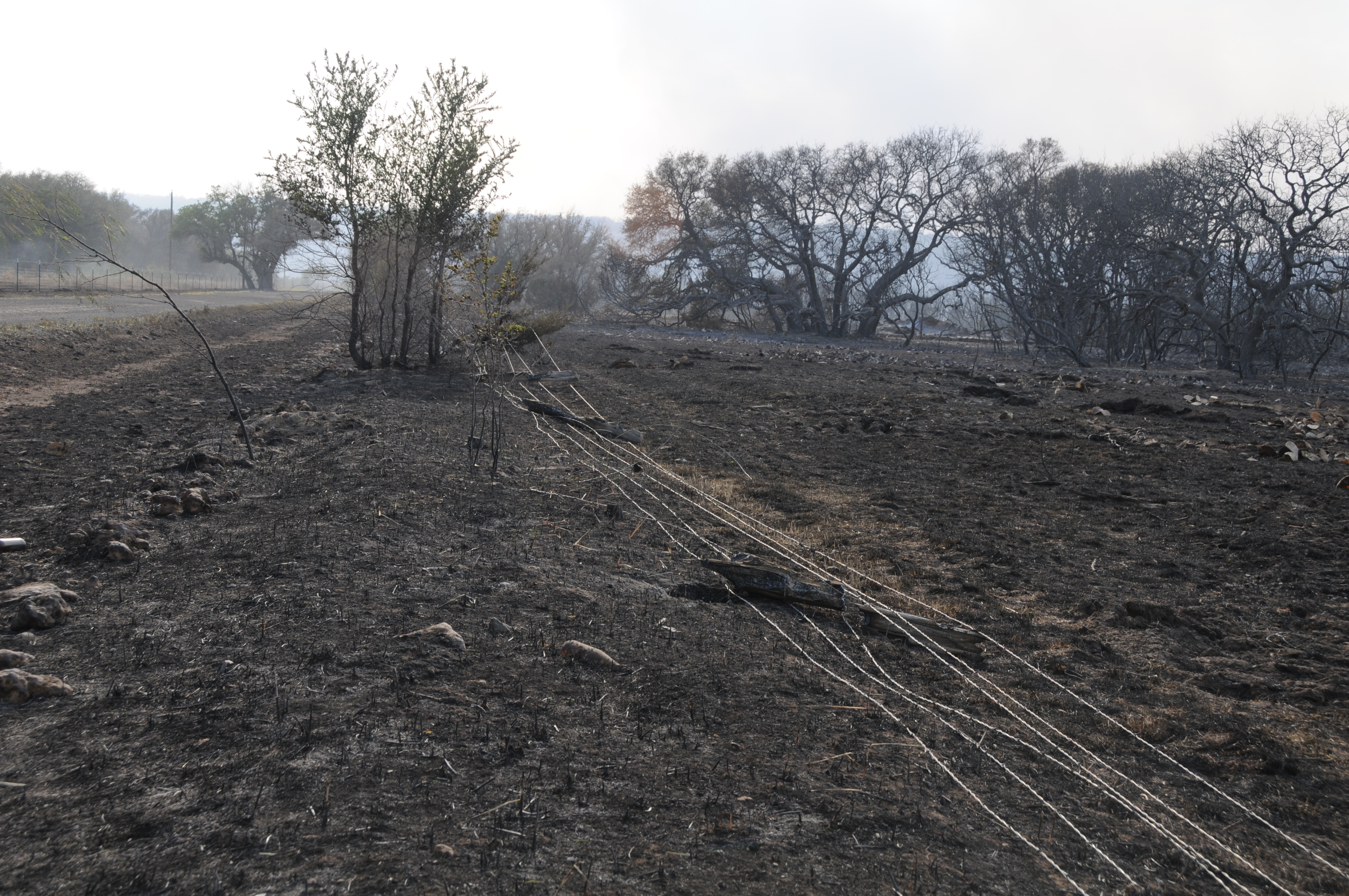 North of Strawn, on Robinson Road. Fence posts burned from fire two days ago.