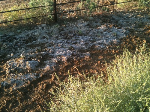 For the first time since last April, frost rests upon the Broke Tree Corral!  The temperature at the ranch house read 35 deg. F., but when I walked down to the corral, I saw frost.  Then I photographed frost on the horse apples and soil (I could have photographed frost on the trailer, but this was a neat pic with green tumbleweed).