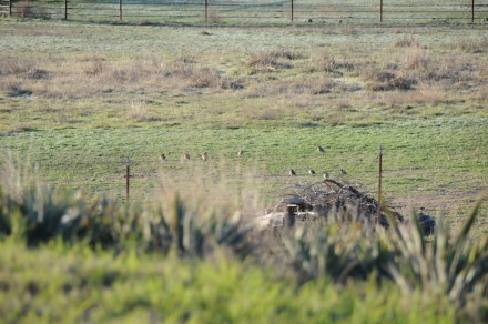 The photograph below captures the small flock on the fence.  When I came back to the house after feeding Star I looked out the front window and saw that the flock (or another group) had come around to the front of the house and was feasting on insects and seeds on the front lawn.  You can click on the ‘Larks on barbed wire’ below and obtain a larger image.  I did not get a picture of the flock at the front of the house.