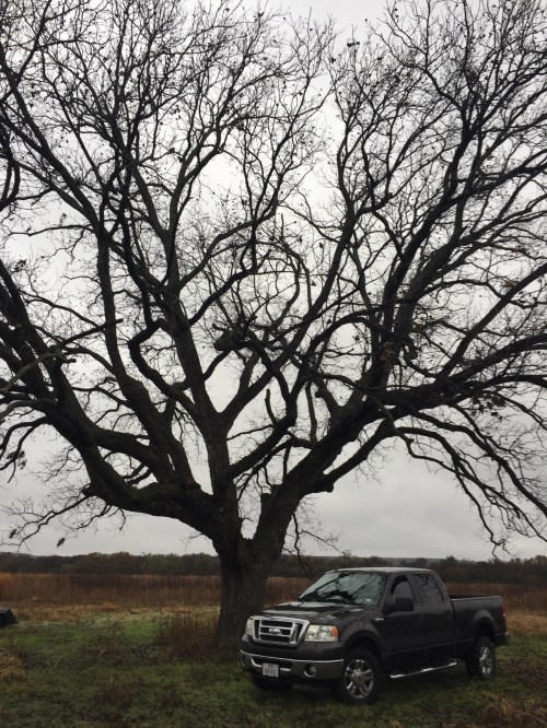 Light rain has fallen in the field. Late fall temperature is 53 degrees, the grass remains green, but most of the pasture has gone into dormancy.  The pecan tree has shed leaves and pecans.
