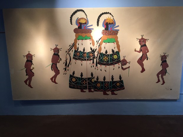 Pop Chalee’s Shalakos and Mudheads is a large painting, about eight feet in length. I saw this painting a few months ago. I’m not for sure it is still on exhibit. You need to email or call to find out if it is still displayed. I am currently in Taos and may go to the museum today.