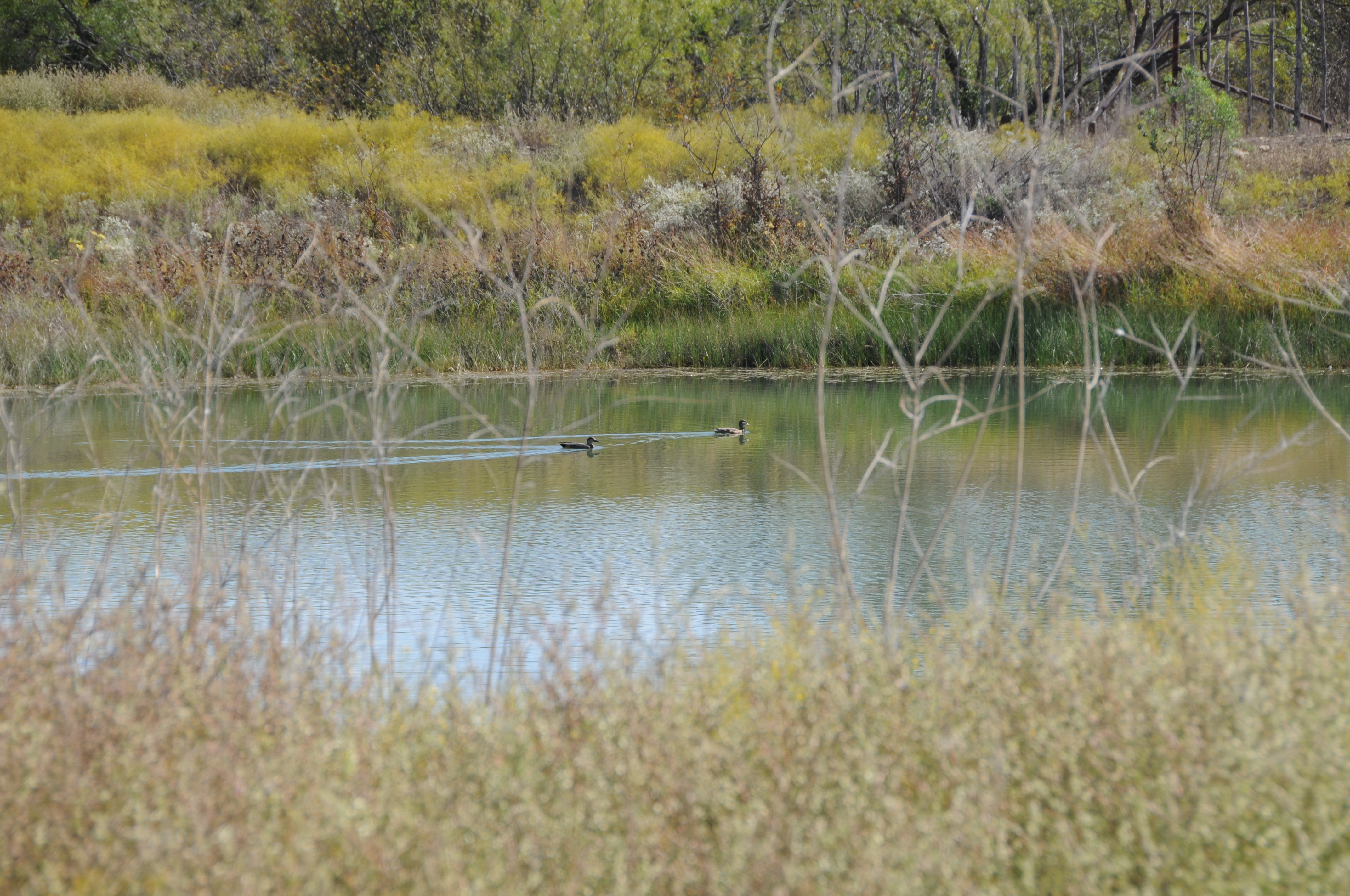 1805. Three or more ducks on pond. No identification. Woodpile near pond has been reduced by rain and natural deterioration. Tree limbs and logs have settled in earth. [Erath County has taken the burn ban off. I’ll not burn the pile because it houses several critters. The ducks are three and they make little noise. They paddle to the far side of the pond as I stride by.]