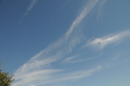 1917. Flock of Sandhill Cranes overhead, flying north to south, catching wind currents. [When I first heard the Sandhills, I looked too high, gave up and then found them at a lower altitude.]