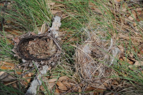 The nest on the left has more black horse hair than white. Some sorrel hair is intertwined. The nest on the right has more white hair woven in. The black horse hairs came from Sweet Hija and Lilly. The sorrel horse hairs emanated from Shiney, Fanny and Wild Flower Gal. The white hairs came from Star.