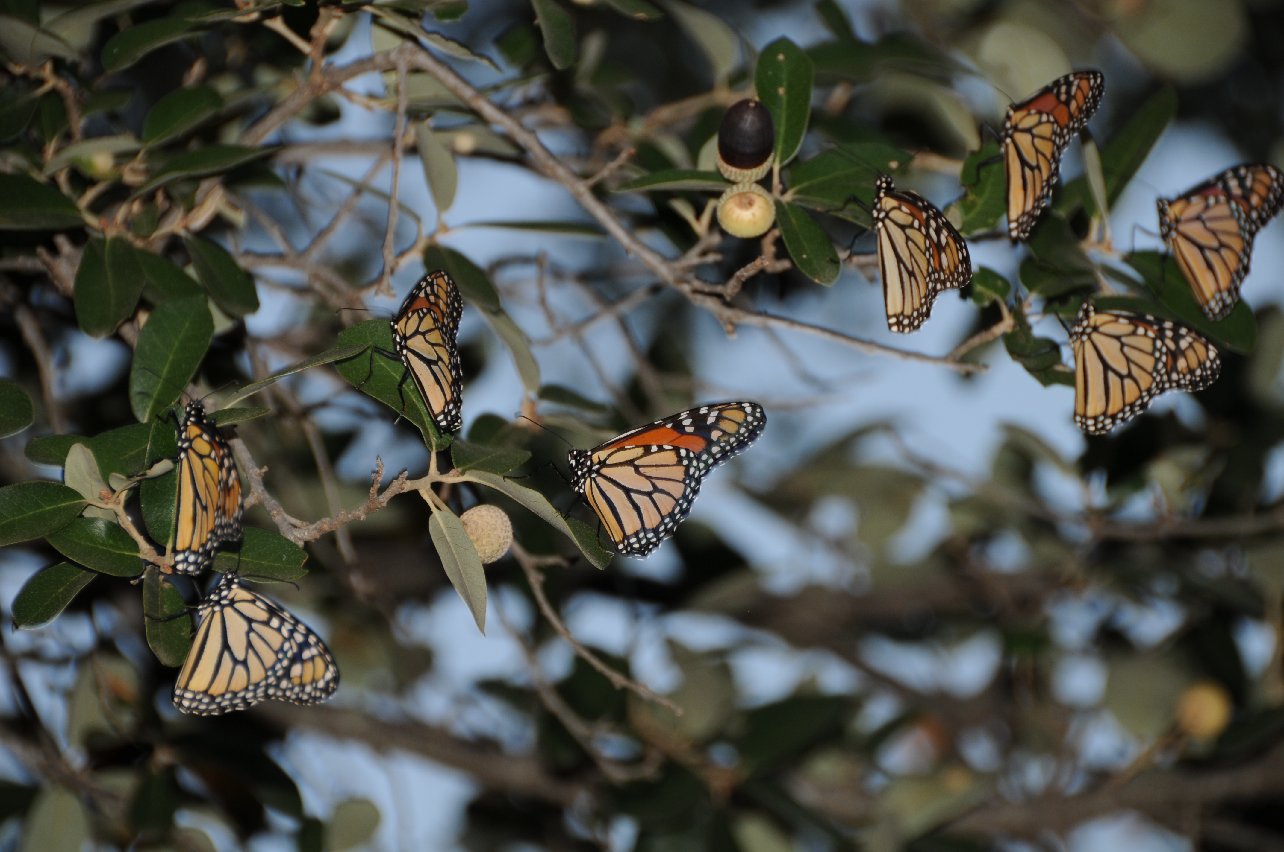 Five years ago, Brenda was walking Yeller, our Aussie-Lab mix, and as she came back to the house, Yeller kept looking up in the sky. Brenda, puzzled, looked up and hundreds of Monarch butterflies filled the space above our house. They probably roosted in the grove, but I was unaware of their habit patterns. We have not seen such a sight again.