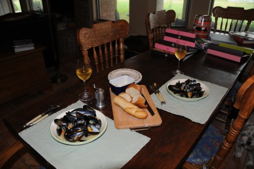 Brenda and I sat down at our French farmhouse table (late-nineteenth-century) and ate mussels with a 2006 Vin D’Alsace Gentil. It was a dry wine and we enjoyed it immensely. After we sat down, Brenda remembered that she needed to put fresh parsley on the mussels, so she did, but I did not get a photograph of the parsley on the pile of mussels because I was chomping down and quaffing wine. After all of the mussels are consumed, we take the shells out onto the pasture road and place them in washouts. At night, critters browse on the remains of the mussels and I have seen our mussel shells 200 yards from where I have laid them. Our barn cats enjoy a few remnants as well.