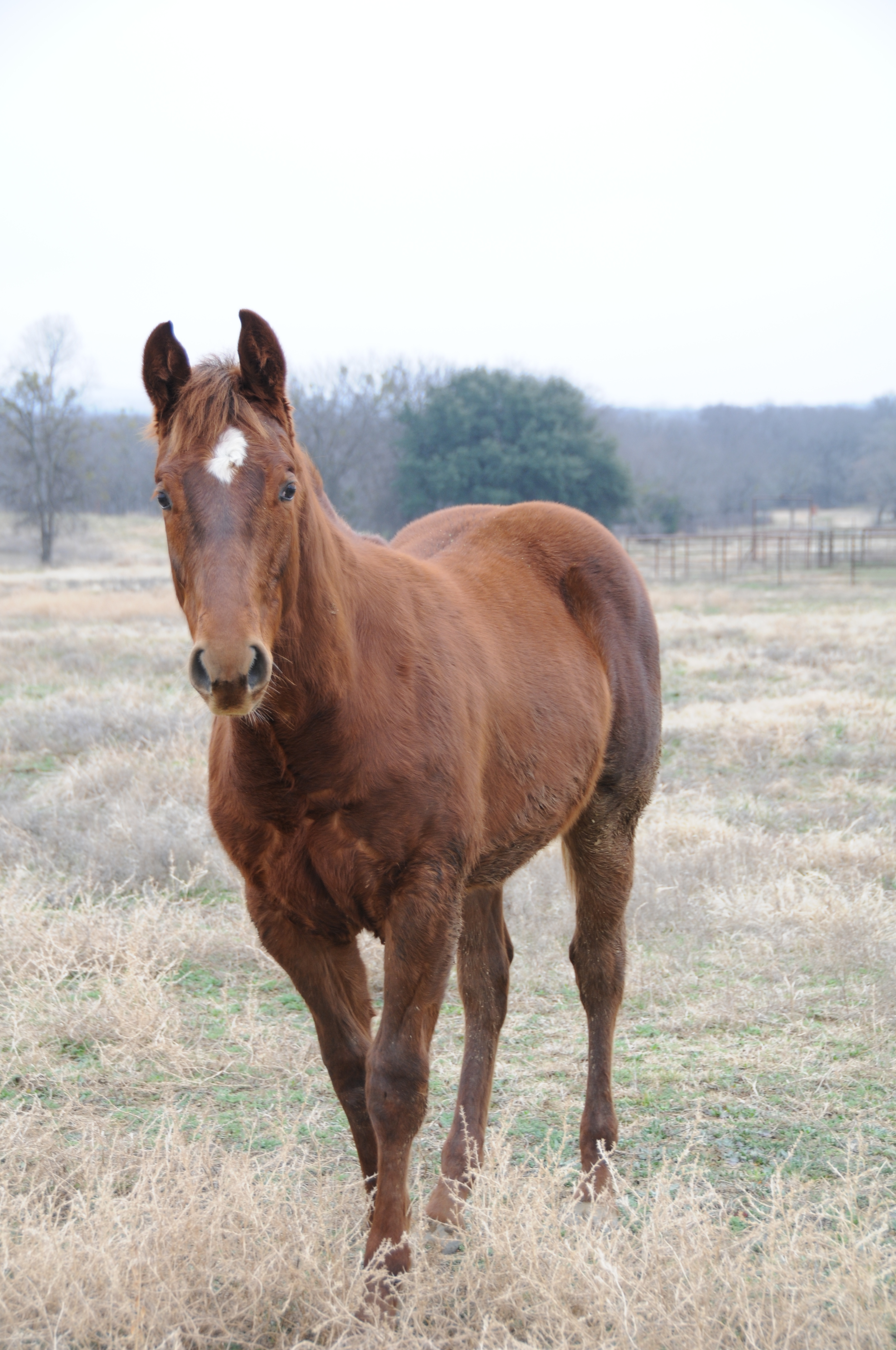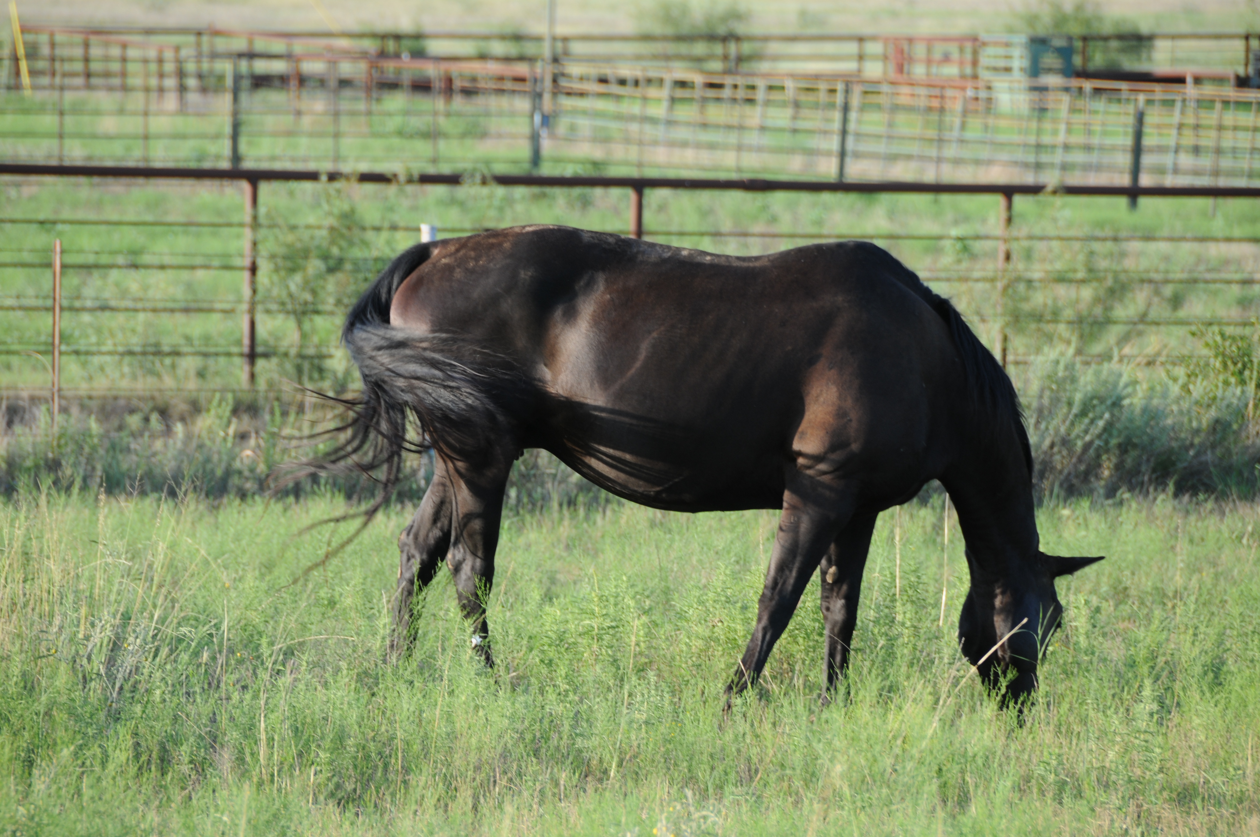 This is Shiners Fannin Peppy or “Fanny.” Fanny has been in training — elementary school — for a hundred days with Duncan Steele-Park at the GCH Land & Cattle Company of Weatherford, Texas. Fanny is a daughter of Sweet Hija below. Fanny is quite vocal. She will begin to nicker once she knows that I am going to feed. It is a vocalization that is more of a chortle, kind of a gargle, deep-down in her throat. Fanny will continue to nicker-chortle every fifteen seconds or so until I put feed in her bin. Translation to English: “Oh, boy, I can’t wait, can’t wait for my grain. Oh, boy, oh boy.”