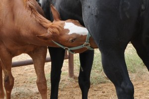 This is Shiners Fannin Peppy or “Fanny.” Fanny has been in training — elementary school — for a hundred days with Duncan Steele-Park at the GCH Land & Cattle Company of Weatherford, Texas. Fanny is a daughter of Sweet Hija below. Fanny is quite vocal. She will begin to nicker once she knows that I am going to feed. It is a vocalization that is more of a chortle, kind of a gargle, deep-down in her throat. Fanny will continue to nicker-chortle every fifteen seconds or so until I put feed in her bin. Translation to English: “Oh, boy, I can’t wait, can’t wait for my grain. Oh, boy, oh boy.”