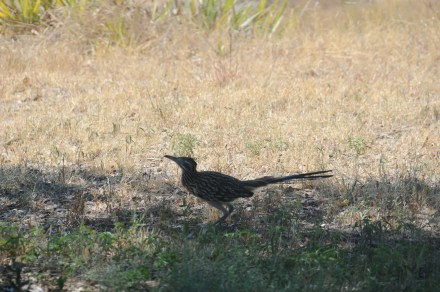 Roadrunners occupied a minor niche in my bird and animal kingdom as I grew up in central Texas.  My Aunt Lennie McRorey who lived on a ranch with her husband in San Saba County, Texas, kept a minor collection of roadrunner figurines and commissioned a small oil painting of a roadrunner that my daughter displays on her end table in Lubbock.  Driving down highways and especially back roads, roadrunners flew or ran across the road in front of the car.  I never saw any remains of roadrunners beside the road, attesting, I think, to their agility and speed.  They were big and seemed amusing the way they ran and picked at insects along the highways.  In a way, the roadrunner to me seemed unique among birds, more of an ostrich-like being than a flight creature — a miniature ostrich, for sure.