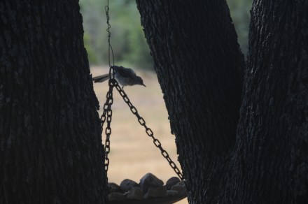 A mockingbird resides in a live oak tree on the east side of the terrace beside the house.  For several days I have observed roadrunners coming up to the terrace early in the morning and mid-afternoon to feast on grasshoppers.  Occasionally, the roadrunners will scale a separate live oak tree from the mockingbird’s nest only to be thrown back, not by cauldrons of burning drought-oil in Texas, but by the fierce, unrelenting assault of the mockingbird.  The trees upon the terrace are mockingbird territory!  Beware aliens!  The mockingbirds will allow red-headed woodpeckers to pierce bark for a meal, but not the roadrunner.