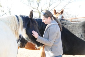 This young woman is Jennifer Connell, my daughter-in-law, and she is engaging Star, Sweet Hija, and Fanny (looking over Hija’s withers).  Jennifer is in her second year of law school at Texas Wesleyan University.  Recently married to my step-son, she also works at Wesleyan to help defray expenses.  As we were walking back to the ranch house, she said that she wants horses again in her life, as she had been around them growing up in north Texas.  The New Year for Jennifer will be difficult, attending school, settling into her marriage, and working.  But, beneath the stress and grind, she prevails into the year, performing in class and rewriting her notes for clarity.  The New Year for her and Michael, her husband, will bring accomplishment of goals that will set their path for the future.  Star, the paint, when Jennifer visits, will lower her blood pressure and give companionship that only a horse can do.  “There’s something about the outside of a horse, that is good for the inside of a woman.”  And, a man.